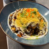 Crushed samosa deliciously filled with mildly spiced potatoes chana, green peas, and layered with chutney and sweet yogurt.